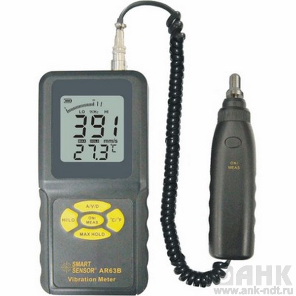 Портативный виброметр AR63B является профессиональным прибором для измерения уровня вибрации. Цифровой виброметр позволяет изменять ускорение, скорость, а также смещение. Все измерения производятся прибором AR63B посредством выносного пьезоэлектрического преобразователя, произведенного из керамического материала. Датчик ускорения передает сигналы вибрации к самому прибору, который преобразует и анализирует измерения. Прибор умеет измерять температуру. Электронный виброметр имеет обширную сферу использования: химическая и нефтяная промышленность, энергетика, транспорт, машиностроение.